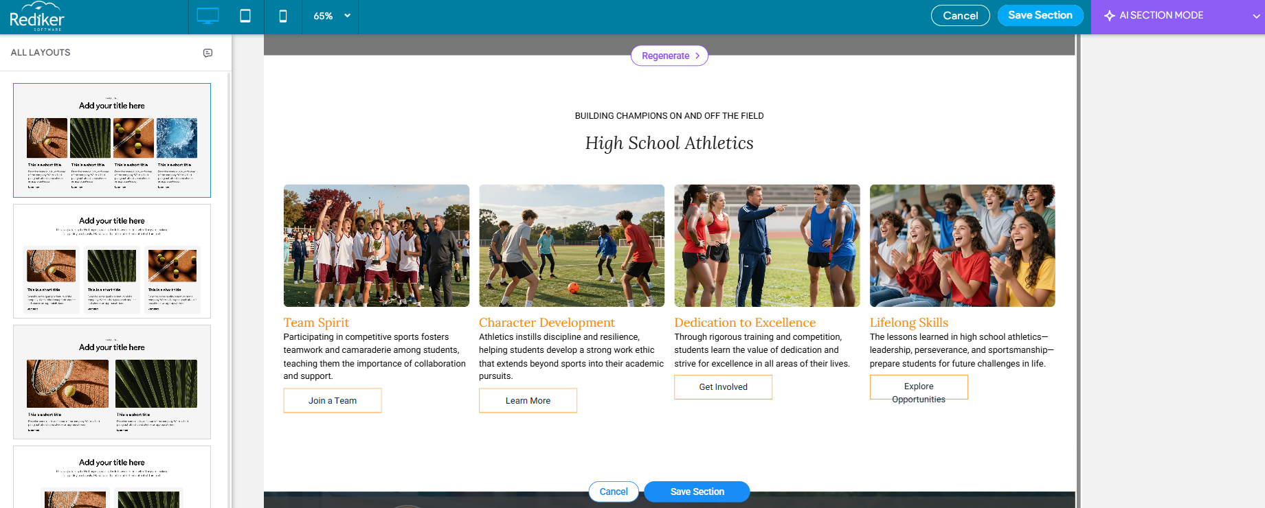 You can generate, a complete section of content using the AI Assistant. This will produce sections of content complete with titles, text, and images. The tool will give you multiple sections to choose from.